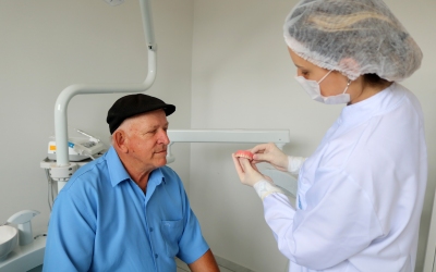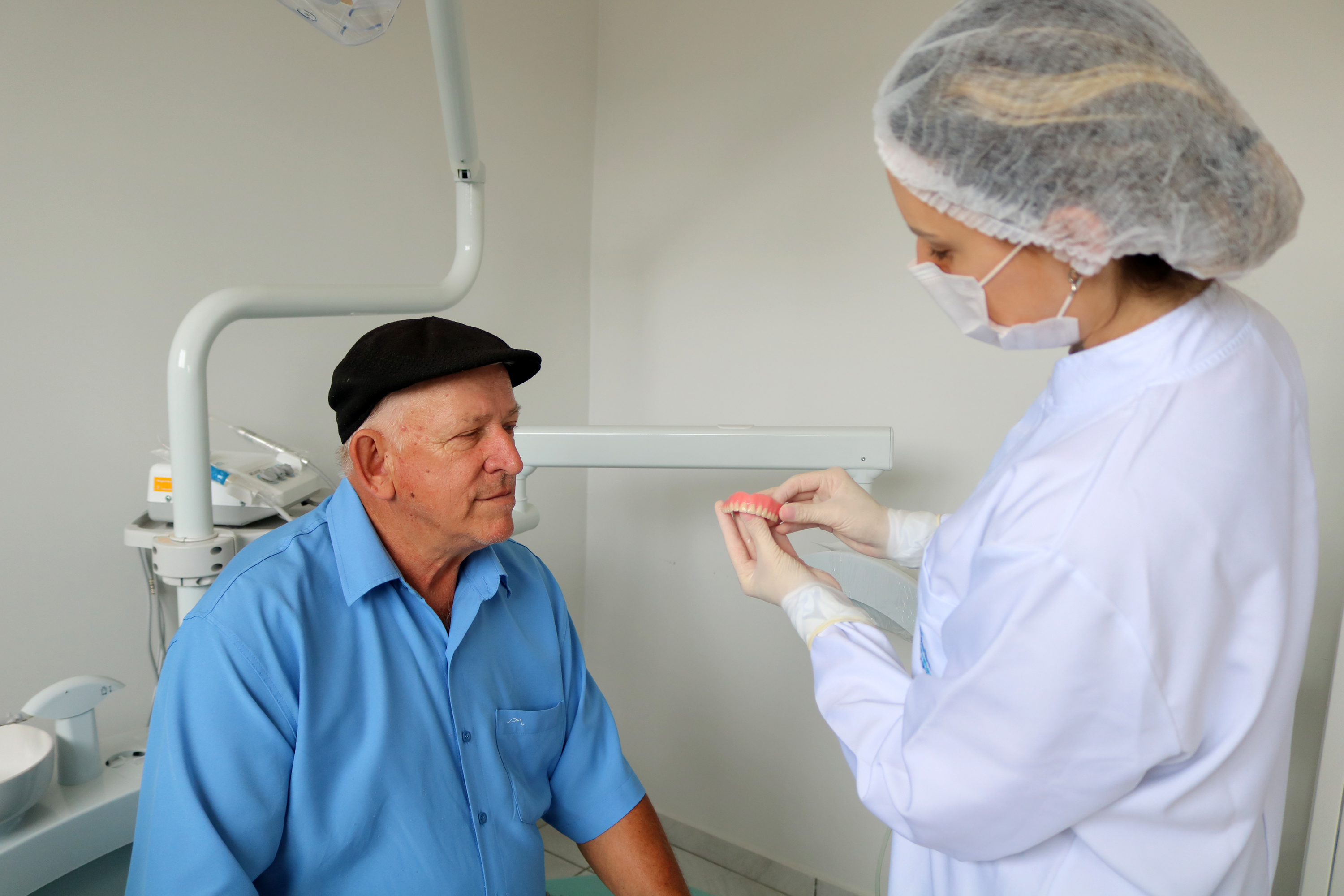 Um dos pacientes atendidos é Egon Sontag, que na visita mais recente à Dra. Jéssica Zambiasi, dentista que conduz o projeto de confecção de próteses dentarias, fez o teste da prótese que receberá nos próximos dias.