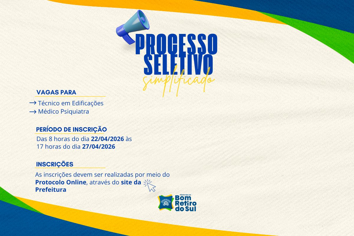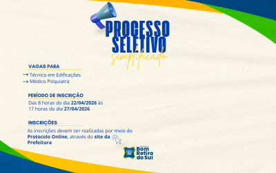 O Edital 28/2026 com todas as orientações e requisitos para participar do certame está disponível no portal https://bomretirodosul.rs.gov.br/portal/rh/?t=2 no botão “Processos Seletivos” ou pelo link https://bomretirodosul.rs.gov.br/arquivos/1776432451.2244.pdf