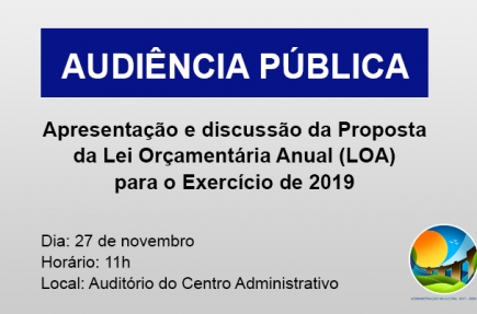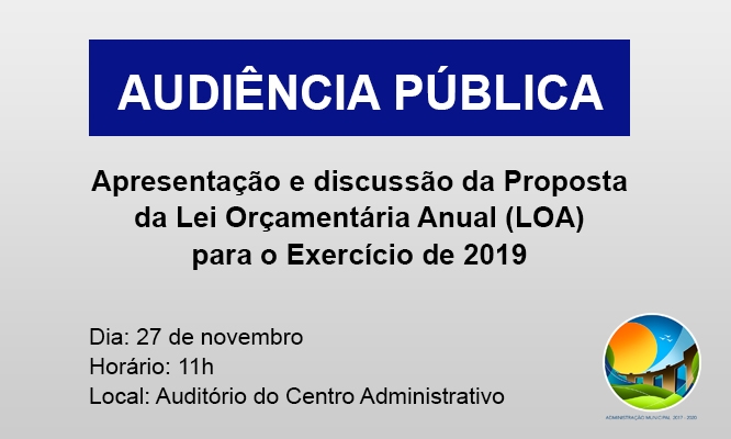 A Administração Municipal de Bom Retiro do Sul convida toda a população para uma Audiência Pública no dia 27 de novembro, para apresentação e discussão da Proposta da Lei Orçamentária Anual (LOA) para o Exercício de 2019.