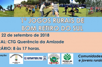 Durante todo o dia do sábado, 22, a partir das 8h nas dependências do CTG Querência da Amizade, de Bom Retiro do Sul, estará acontecendo à primeira edição dos Jogos Rurais. O evento é organizado em parceria entre Emater/RS-Ascar, Secretaria da Agricultura e Meio Ambiente, CTG Querência da Amizade, Sindicato dos Trabalhadores Rurais da Agricultura Familiar, comunidade e jovens rurais.